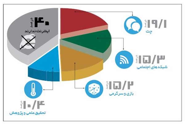 براساس نتایج تحقیق وزارت ورزش و جوانان 67/4درصد از جوانان از اینترنت استفاده می‌کنند که 19/1درصد آنان برای چت، 15/3درصد به‌منظور ارتباط با شبکه‌های اجتماعی، 15/2درصد برای سرگرمی و بازی و 10/4درصد برای تحقیق و پژوهش‌های علمی از اینترنت بهره می‌برند. به گفته حسن‌زاده کمتر از 5درصد از جوانان از اینترنت برای مراجعه به سایت‌های غیراخلاقی و موارد غیرضرور استفاده می‌کنند و 12/3درصد از اینترنت برای دانلود فیلم، موسیقی و عکس بهره می‌گیرند. 39درصد از پاسخگویان فرار از تنهایی و سرگرمی و 22/3درصد از آنان ارتباط و تبادل تجربه را انگیزه خود برای استفاده از شبکه‌های اجتماعی ذکر کردند و کمتر از 5درصد از این افراد از شبکه‌های اجتماعی برای مسائل غیرضرور استفاده می‌کنند. ضمن اینکه 69/3درصد پاسخگویان برای بهره‌گیری از اینترنت از فیلترشکن استفاده می‌کنند.